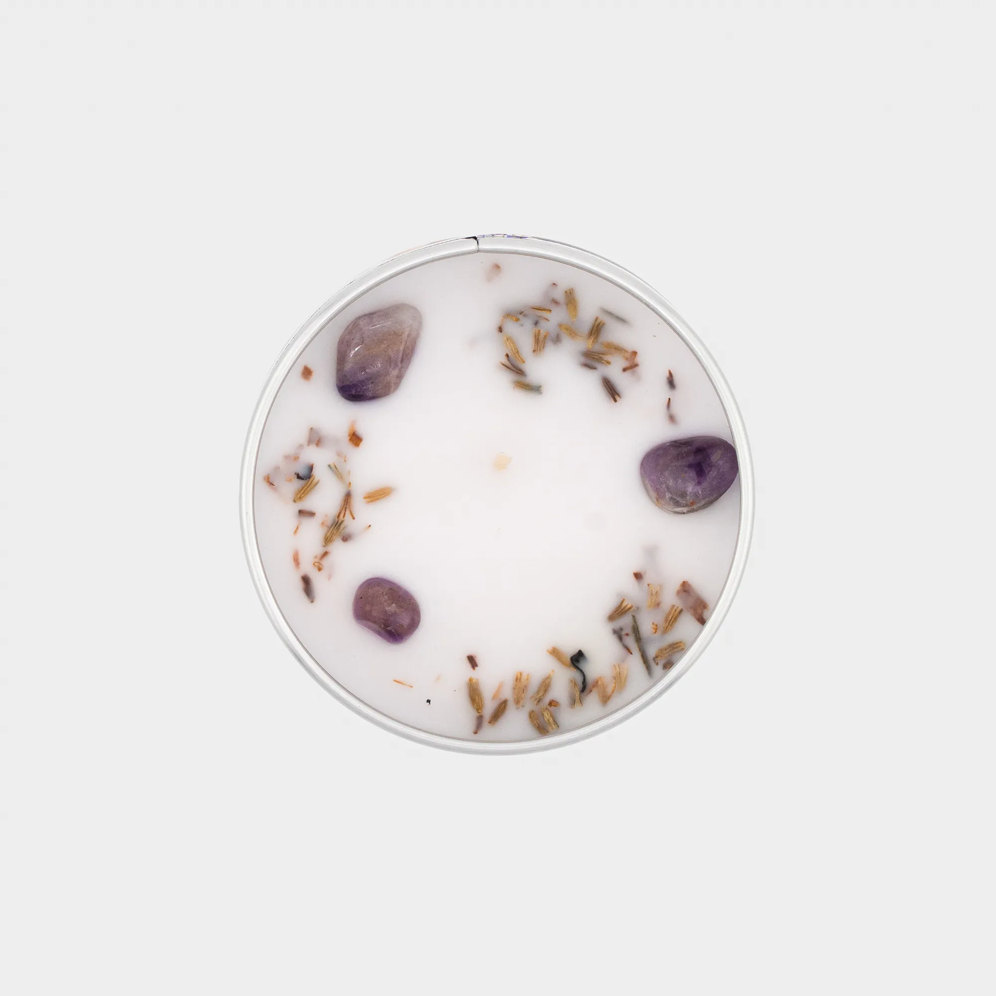 💡 Bougie artisanale apaisante à la lavande, incrustée d’améthyste naturelle.