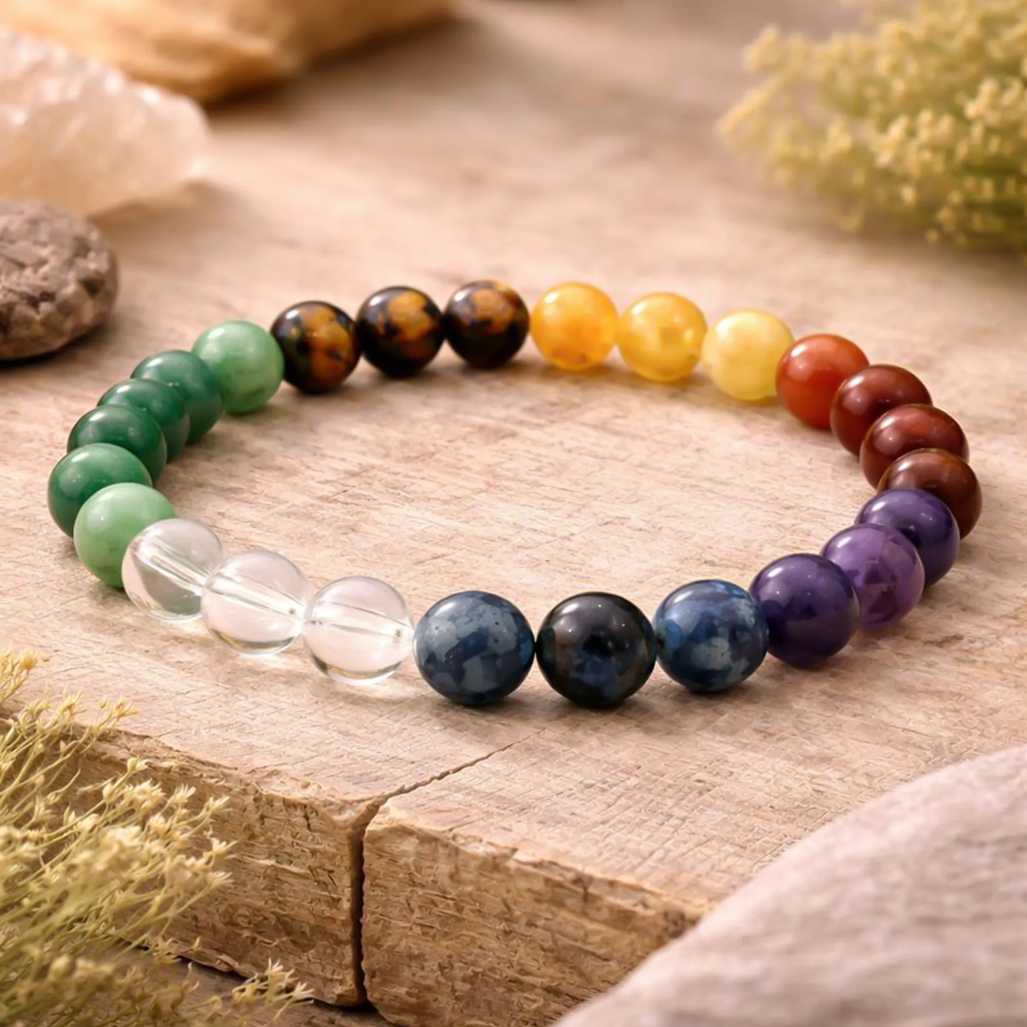 Composé de perles naturelles Qualité Extra, soigneusement sélectionnées pour leur pureté, leur intensité de couleur et leur énergie vibrante, ce bracelet associe sept pierres complémentaires, chacune traditionnellement liée à un centre énergétique du corps. L’ensemble forme un équilibre harmonieux, visuellement élégant et énergétiquement cohérent.