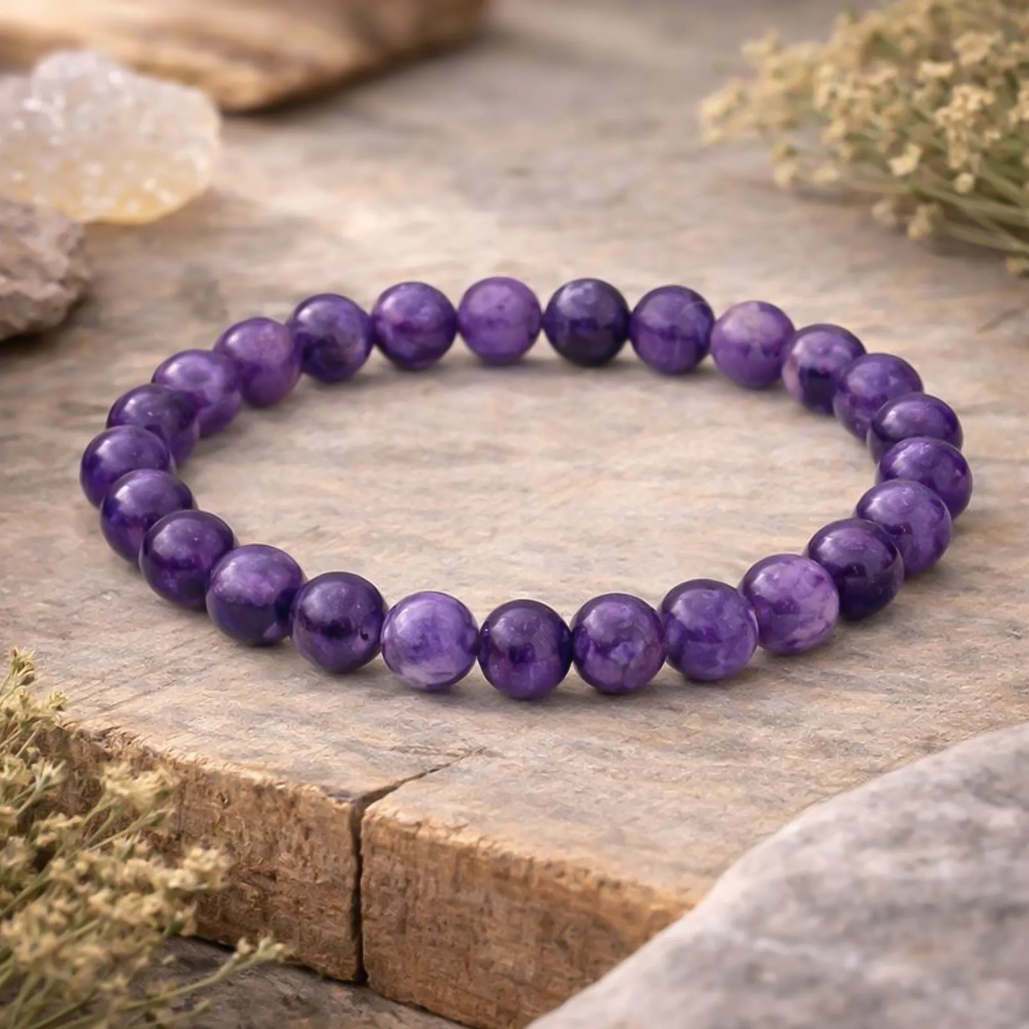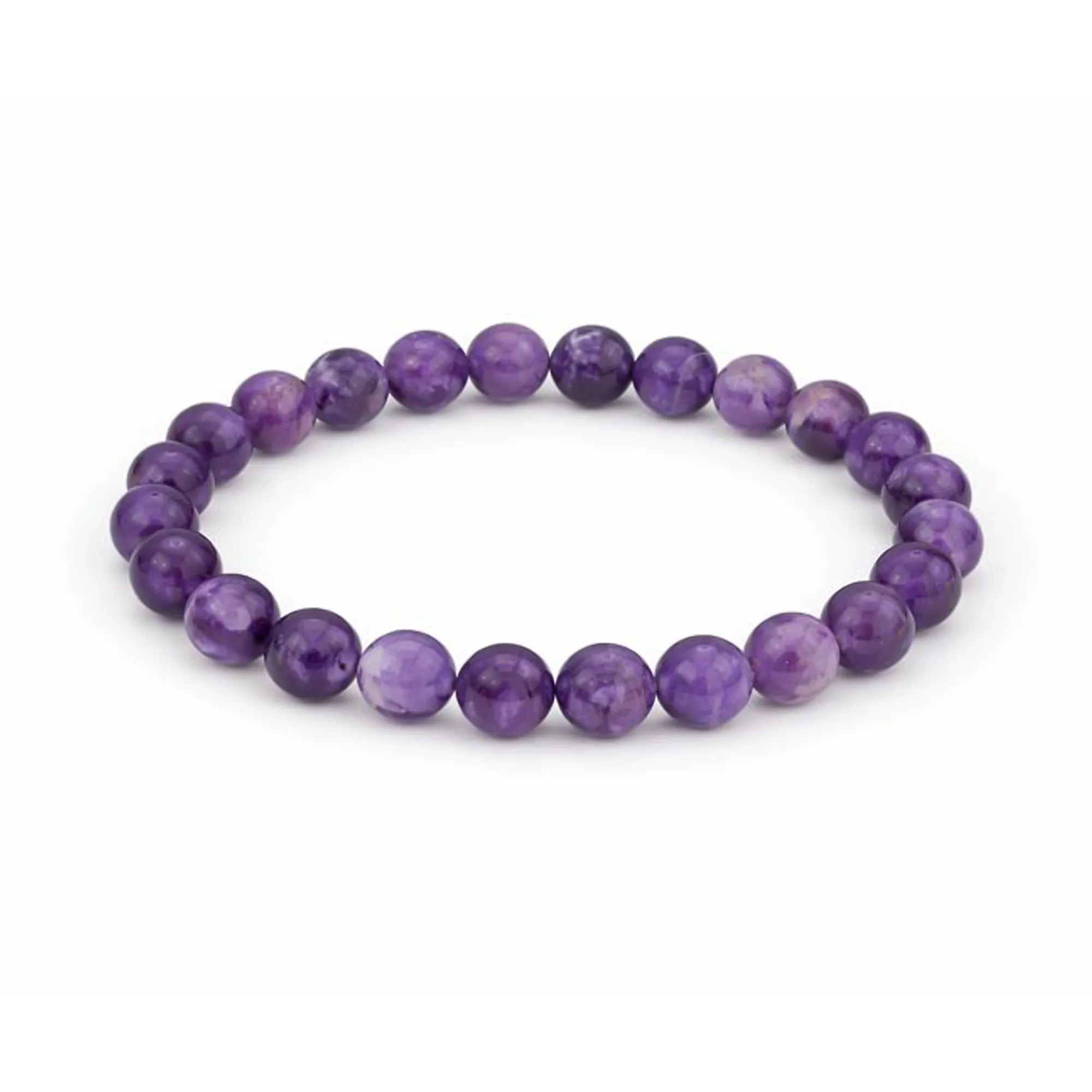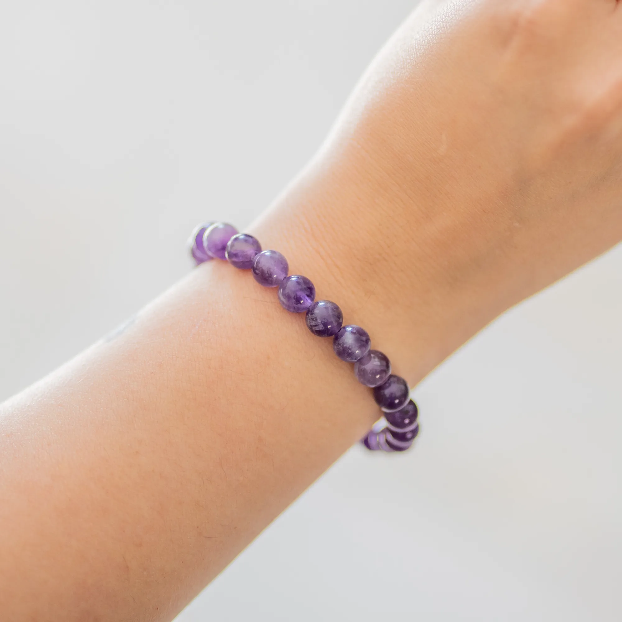 Bracelet en Améthyste Qualité Extra, perles 8 mm. Une pierre apaisante, reconnue pour favoriser la sérénité, la clarté émotionnelle et le calme intérieur.