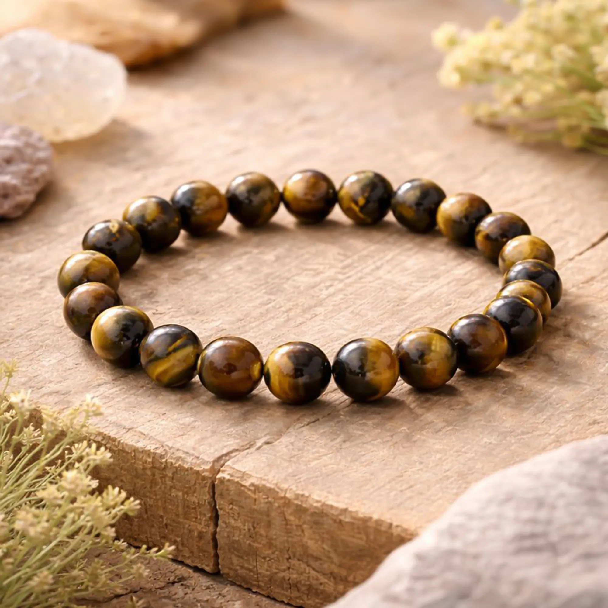 Ce bracelet en Œil de Tigre Qualité Extra se distingue par ses reflets chatoyants uniques, allant du doré profond aux nuances ambrées. Chaque perle révèle des éclats lumineux en mouvement — le fameux effet “œil de chat” — preuve d’une sélection minutieuse de pierres denses, pures et parfaitement polies.